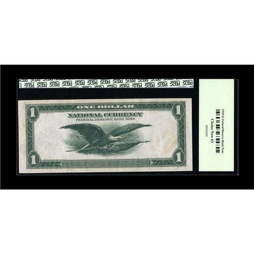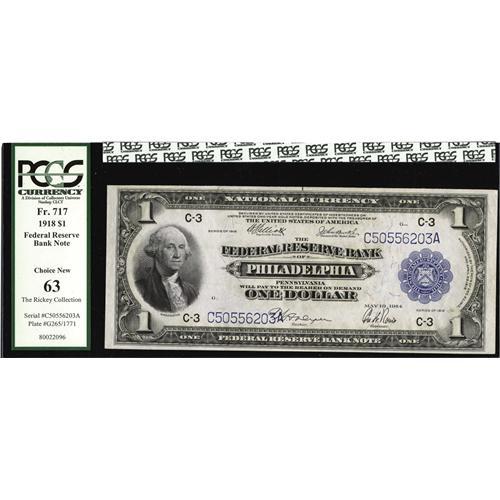 <B>Fr. 717 $1 1918 Federal Reserve Bank Note PCGS Choice New 63.</B></I> If the margin at bottom were a touch bigger, this deeply embossed note would have surely graded Gem.<BR><I>Ex: Rickey Collection</B></I>