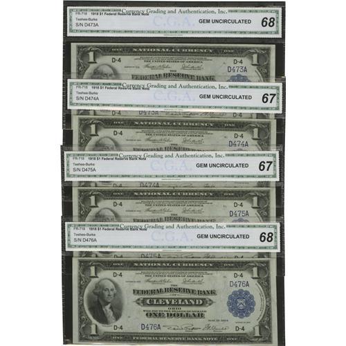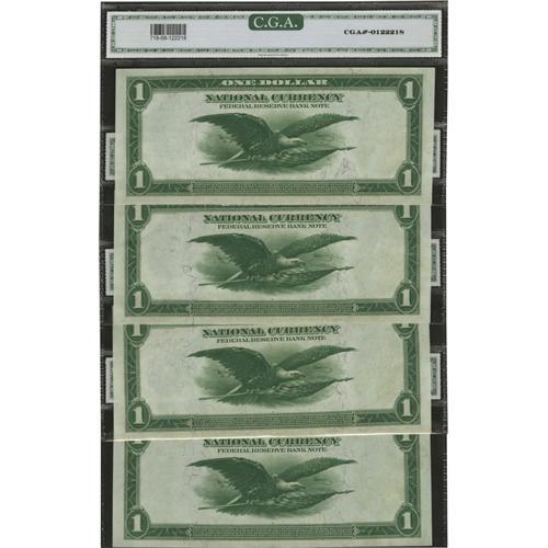 <B>Fr. 718 $1 1918 Federal Reserve Bank Notes Cut Sheet of Four CGA Gem Uncirculated 68 (2) & Gem Uncirculated 67 (2).</B></I> Natural paper wave is noticed on this pleasing low three digit serial number cut sheet that carries serial 473, 474, 475 and 476. It has been many years since we have had the privilege of bringing a sheet such as this to auction. All the notes are colorful, with drop dead centering and excellent margins. Sure to please.<BR><BR><b>Shipping:</b> Coins & Currency (<a target="_blank" href="http://www.heritageauctions.com/common/shipping.php">view shipping information</a>)