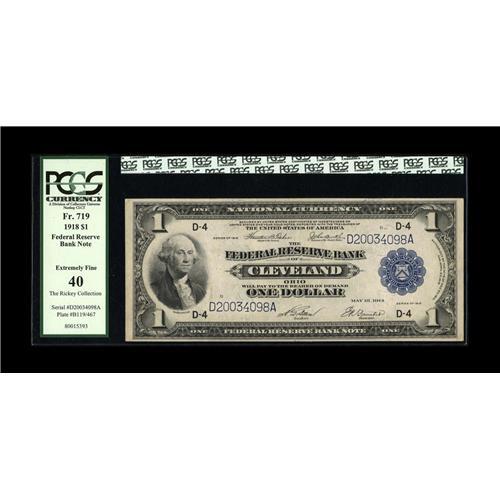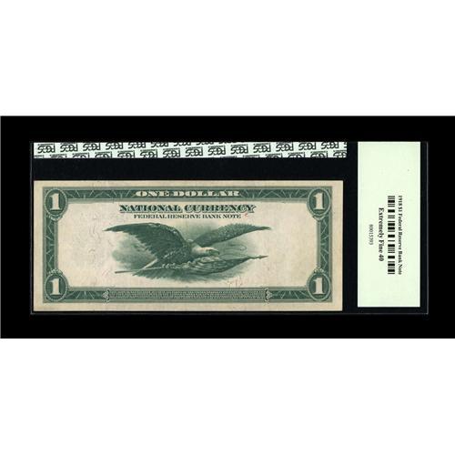 <B>Fr. 719 $1 1918 Federal Reserve Bank Note PCGS Extremely Fine 40.</B></I> The three folds that account for the grade can be seen on back, though the overall face appearance of this note is About New.<BR><I>Ex: Rickey Collecton</B></I>