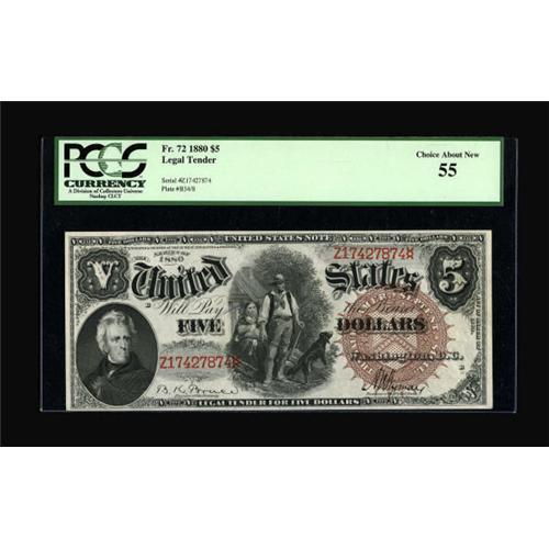 <B>Fr. 72 $5 1880 Legal Tender PCGS Choice About New 55.</B></I> A bright representative for the grade with an almost invisible fold.<BR><BR><b>Shipping:</b> Coins & Currency (<a target="_blank" href="http://www.heritageauctions.com/common/shipping.php">view shipping information</a>)