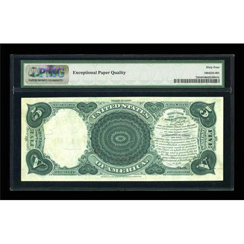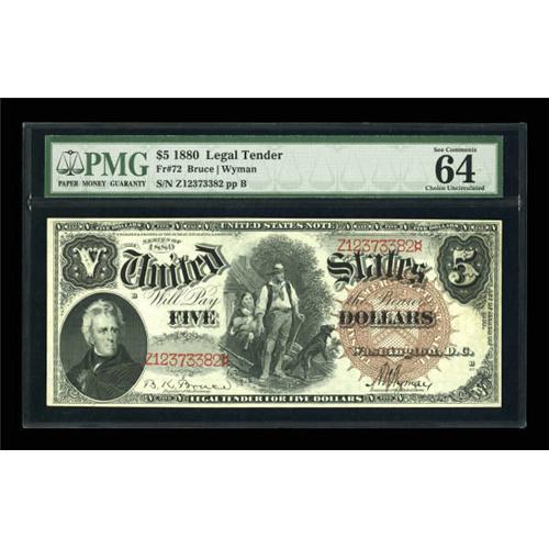 <B>Fr. 72 $5 1880 Legal Tender PMG Choice Uncirculated 64 EPQ.</B></I> Although this note was not used, this Friedberg number is illustrated on page 75 of the Dauers' currency history book. A handful more than 100 of Fr. 72 are known. PMG has graded four of them at this level and seven higher.<BR><I>From The Dr. Edward & Joanne Dauer Collection</B></I><BR><BR><b>Shipping:</b> Coins & Currency (<a target="_blank" href="http://www.heritageauctions.com/common/shipping.php">view shipping information</a>)