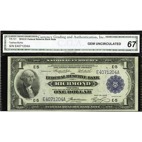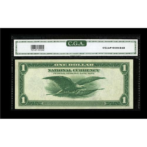 <B>Fr. 721 $1 1918 Federal Reserve Bank Note CGA Gem Uncirculated 67.</B></I> One of the highest third party graded examples we have handled for this Friedberg number. This nicely centered note displays prominent embossing seen through the holder.