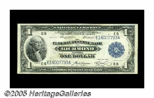 <B>Fr. 721 $1 1918 Federal Reserve Bank Note Extremely Fine.</B></I> A very nice, lightly circulated Richmond Ace with unusually broad margins, original paper surfaces and perfect centering of both sides.