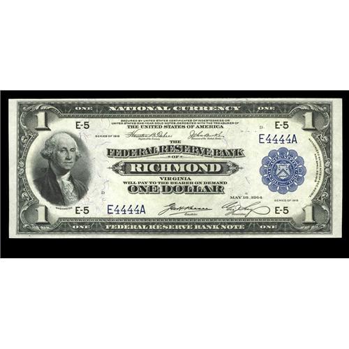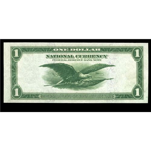 <B>Fr. 721 $1 1918 Federal Reserve Bank Note Superb Gem New.</B></I> A glorious Richmond example that has both its visual appeal and value enhanced by the solid, four-digit serial number E4444A. The note has deep originality, ideal paper surfaces, perfect colors and excellent centering on both sides. A spectacular example of its type that should fetch a very strong price.