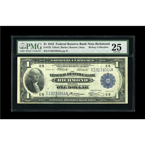 <B>Fr. 722 $1 1918 Federal Reserve Bank Note PMG Very Fine 25.</B></I> This is a slightly better signature combination, with only about a dozen and a half notes having been offered in the last five years. This piece is a picture perfect VF and is wholly original.<BR><I>Ex: Rickey Collection</B></I>