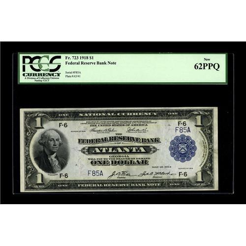 <B>Fr. 723 $1 1918 Federal Reserve Bank Note PCGS New 62PPQ.</B></I> This Atlanta Ace was held from higher grade by a rather heavy counting mark, but that is more than made up for by the two-digit serial number.<BR><I>From The Bill and Kathy Stella Currency Collection</B></I><BR><BR><b>Shipping:</b> Coin/Currency (<a target="_blank" href="http://www.heritageauctions.com/common/shipping.php">view shipping information</a>)