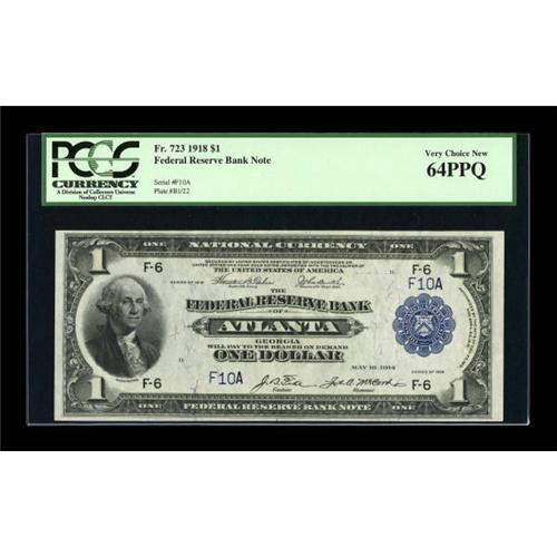 <B>Fr. 723 $1 1918 Federal Reserve Bank Note PCGS Very Choice New 64PPQ.</B></I> This Atlanta $10 FRBN exhibits serial number F10A which has just recently surfaced. A bit more margin at lower right and this is most likely gem.<BR><BR><b>Shipping:</b> Coins & Currency (<a target="_blank" href="http://www.heritageauctions.com/common/shipping.php">view shipping information</a>)