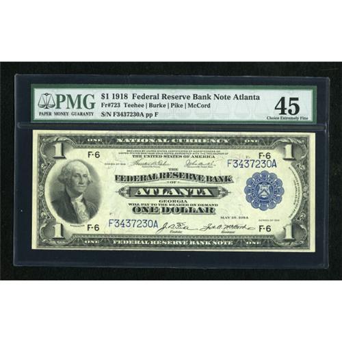 <B>Fr. 723 $1 1918 Federal Reserve Bank Note PMG Choice Extremely Fine 45.</B></I> By far the most common of the Atlanta District FRBN Aces. <BR><BR><b>Shipping:</b> Coins & Currency (<a target="_blank" href="http://www.heritageauctions.com/common/shipping.php">view shipping information</a>)