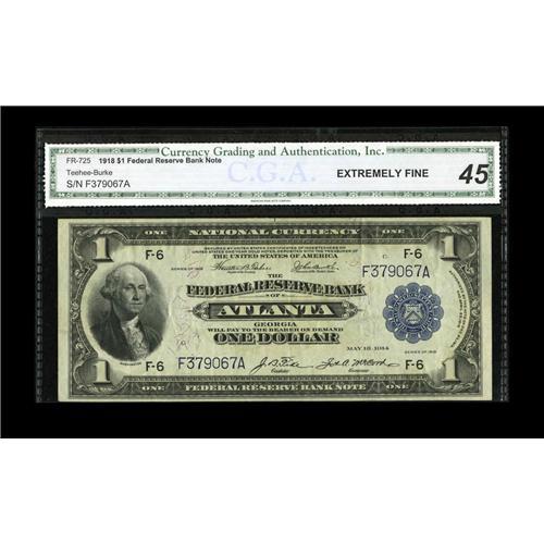 <B>Fr. 725 $1 1918 Federal Reserve Bank Note CGA Extremely Fine 45.</B></I> This popular Atlanta FRBN has exceptional paper quality.