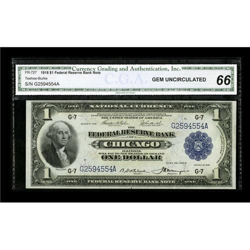 <B>Fr. 727 $1 1918 Federal Reserve Bank Note CGA Gem Uncirculated 66.</B></I> Here is another well embossed "Green Eagle" from Chicago.<BR><BR><b>Shipping:</b> Coins & Currency (<a target="_blank" href="http://www.heritageauctions.com/common/shipping.php">view shipping information</a>)