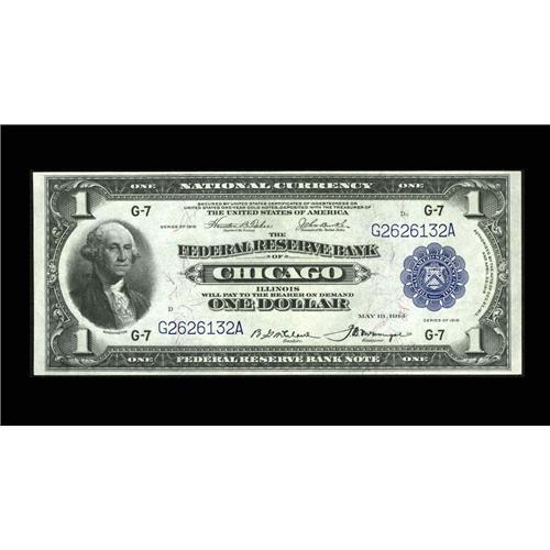 <B>Fr. 727 $1 1918 Federal Reserve Bank Note Choice New.</B></I> While two light storage bends are present to give testimony to this Chicago example's originality, to call this lovely and well centered note anything less than the assigned grade would be a disservice to its unmolested paper surfaces and well balanced centering.