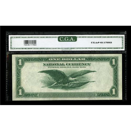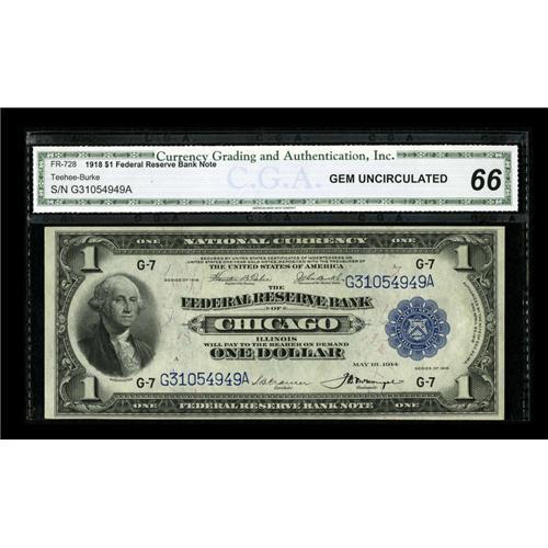 <B>Fr. 728 $1 1918 Federal Reserve Bank Note CGA Gem Uncirculated 66.</B></I> The embossed serial numbers are about to punch through the paper on this example.<BR><BR><b>Shipping:</b> Coins & Currency (<a target="_blank" href="http://www.heritageauctions.com/common/shipping.php">view shipping information</a>)