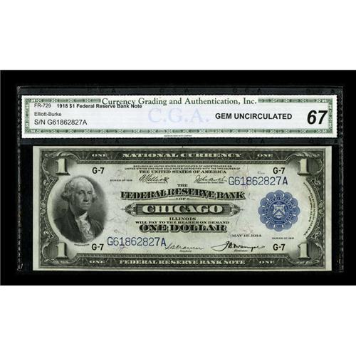 <B>Fr. 729 $1 1918 Federal Reserve Bank Note CGA Gem Uncirculated 67.</B></I> Natural paper wave is noticed on this note.<BR><BR><b>Shipping:</b> Coins & Currency (<a target="_blank" href="http://www.heritageauctions.com/common/shipping.php">view shipping information</a>)
