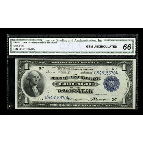 <B>Fr. 729 $1 1918 Federal Reserve Bank Note CGA Gem Uncirculated 66.</B></I> Prominent embossing is found on this $1 FRBN.<BR><BR><b>Shipping:</b> Coins & Currency (<a target="_blank" href="http://www.heritageauctions.com/common/shipping.php">view shipping information</a>)