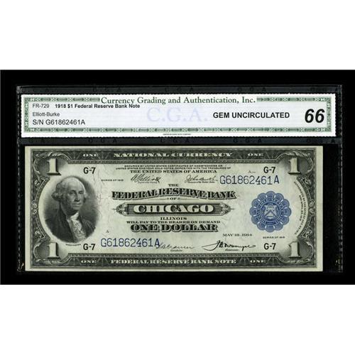 <B>Fr. 729 $1 1918 Federal Reserve Bank Note CGA Gem Uncirculated 66.</B></I> The back upper left corner shows some green inking.<BR><BR><b>Shipping:</b> Coins & Currency (<a target="_blank" href="http://www.heritageauctions.com/common/shipping.php">view shipping information</a>)