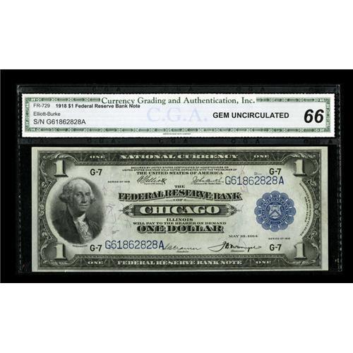 <B>Fr. 729 $1 1918 Federal Reserve Bank Note CGA Gem Uncirculated 66.</B></I> Natural paper wave adorns this Ace.<BR><BR><b>Shipping:</b> Coins & Currency (<a target="_blank" href="http://www.heritageauctions.com/common/shipping.php">view shipping information</a>)