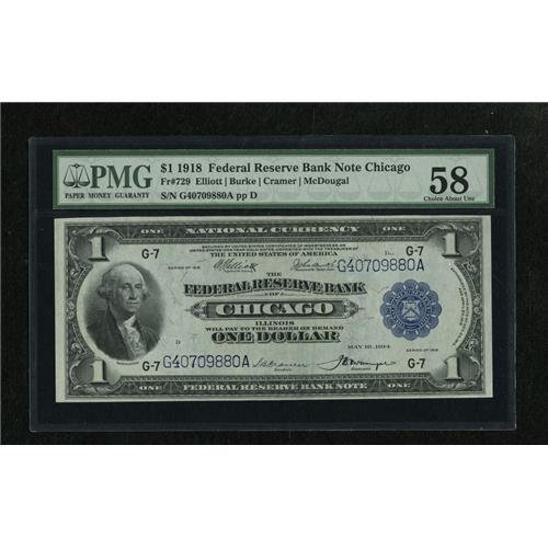 <B>Fr. 729 $1 1918 Federal Reserve Bank Note PMG Choice About Unc 58.</B></I> No obvious folds or bends are seen through the third party holder. The color is most pleasing.<BR><I>From The Collection of Greg Southward</B></I><BR><BR><b>Shipping:</b> Coins & Currency (<a target="_blank" href="http://www.heritageauctions.com/common/shipping.php">view shipping information</a>)