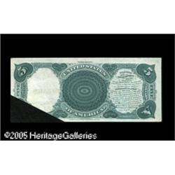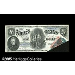 <B>Fr. 73 $5 1880 Legal Tender About Uncirculated.</B></I> One of the greatest large size errors in the collection, as this is both a major foldover and an obstruction error, with only a small part of the large seal showing that is not printed on the folded over portion. This is a beautiful piece which will likely realize somewhere in the neighborhood of... Lot:15005