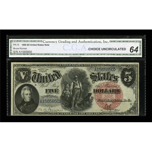 <B>Fr. 73 $5 1880 Legal Tender CGA Choice Uncirculated 64.</B></I> Decent margins and perfect embossing are noted on this piece. The right margin shows some signs of having been professionally helped.<BR><BR><b>Shipping:</b> Coins & Currency (<a target="_blank" href="http://www.heritageauctions.com/common/shipping.php">view shipping information</a>)