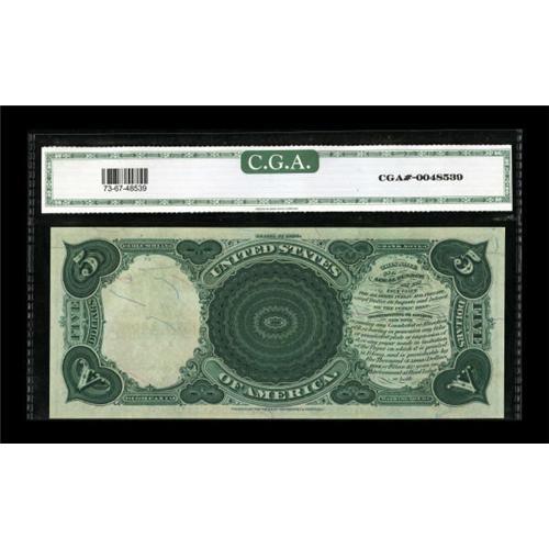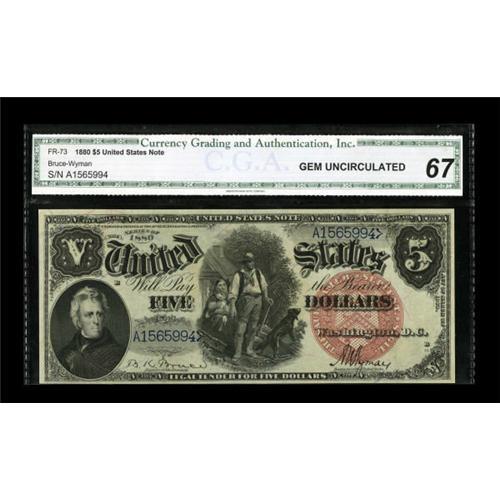 <B>Fr. 73 $5 1880 Legal Tender CGA Gem Uncirculated 67.</B></I> The margins are solid for the issue and complement the appealing paper and bright seal and serial numbers.<BR><BR><b>Shipping:</b> Coins & Currency (<a target="_blank" href="http://www.heritageauctions.com/common/shipping.php">view shipping information</a>)