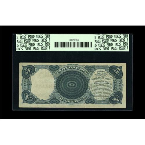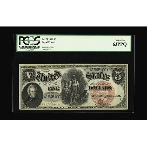 <B>Fr. 73 $5 1880 Legal Tender PCGS Choice New 63PPQ.</B></I> This Large Round Red Seal Five has embossing noticed through the PCGS holder, and the margins are well above average for the type. An excellent choice for a type set.