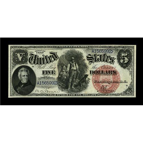 <B>Fr. 73 $5 1880 Legal Tender Gem New.</B></I> The centering on this lovely note is not quite perfect and the top margin is a bit tight, but the overall paper quality and the deep, full embossing makes this a desirable example. A nice example of this design sub-type with a large, plain red Treasury seal and blue serial numbers.<BR><BR><b>Shipping:</b> Coin/Currency (<a target="_blank" href="http://www.heritageauctions.com/common/shipping.php">view shipping information</a>)