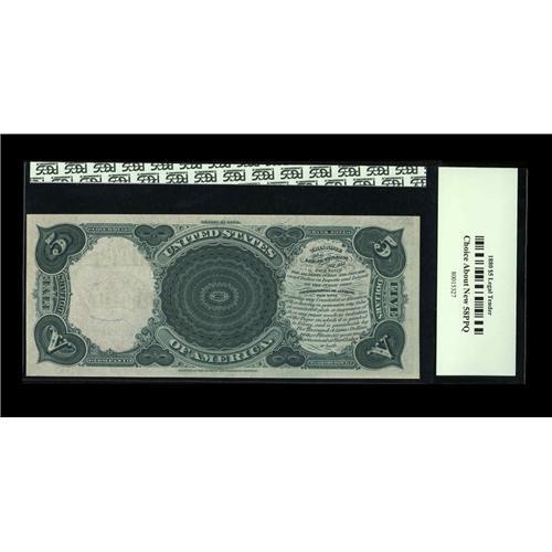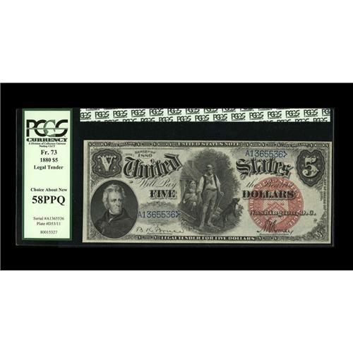 <B>Fr. 73 $5 1880 Legal Tender PCGS Choice About New 58PPQ.</B></I> Outstanding paper originality that can be easily seen through the PCGS holder. There is a broad corner fold into the design that is clearly the cause of the 58 grade.