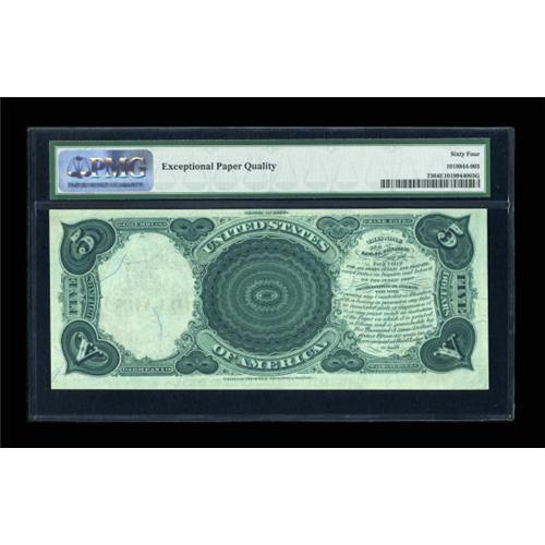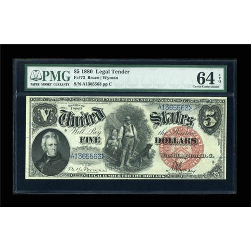 <B>Fr. 73 $5 1880 Legal Tender PMG Choice Uncirculated 64 EPQ.</B></I> The "Exceptional Paper Quality" comment adds considerably to the value of this high-end Choice Large Red Seal Pioneer Five. With a touch more margin at the right-end of the bottom, this piece would have certainly rated the full Gem grade.<BR><BR><b>Shipping:</b> Coins & Currency (<a target="_blank" href="http://www.heritageauctions.com/common/shipping.php">view shipping information</a>)
