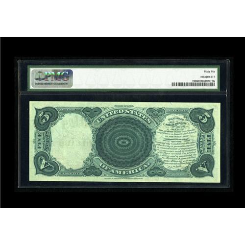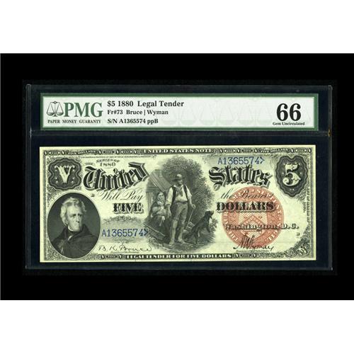 <B>Fr. 73 $5 1880 Legal Tender PMG Gem Uncirculated 66.</B></I> The 1880 $5 with the Pioneer Family vignette is always popular with the collecting fraternity. This Gem example is enhanced by its well balanced centering. This note is from a run of closely grouped serial numbers listed in the Gengerke census as "CU", likely all from a pack put away and then dispersed long ago.<BR><BR><b>Shipping:</b> Coin/Currency (<a target="_blank" href="http://www.heritageauctions.com/common/shipping.php">view shipping information</a>)