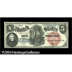 Fr. 73 $5 1880 Legal Tender Very Choice Crisp Uncircula <B>Fr. 73 $5 1880 Legal Tender Very Choice New.</B></I> A very pretty example with tremendous colors and cavernously deep embossing that must be seen to be truly appreciated. Gem, but for the slightly imperfect centering. <BR><BR><B>Important notice:</B> Heritage usually auctions material at the rate of 200-250 lots per hour. On some occasions eBay Live bid software or the Internet may not be able to keep up with the pace of the auction. We recommend placing a realistic absentee bid now as insurance to avoid disappointment. Occasionally the auctioneer may eliminate or reject an eBay Live bid, and the auctioneer may also reopen a lot after the close of the eBay live bidding (usually because we missed an audience bid), and may reject your bid even if it shows you as the winning bidder. By bidding via eBay Live, you agree that Heritage may award the lot to another bidder at its sole discretion under the circumstances described above or any other reasonable circumstances. Since eBay bids are not shown to us until we open the lot on the floor, we treat those bids just like floor bids. In most cases the floor responds before the eBay bid is presented to us, due to Internet lag time, so for consistency we have made it a policy that floor bids are always considered first over tie eBay live bids. Also please note that all Heritage lots purchased through eBay Live carry a 20% Buyer's Premium. Please make sure you read the Terms and Conditions before you bid. This lot is being auctioned in conjunction with a live floor auction by Heritage Galleries & Auctioneers. All final auction and invoice information will be supplied by Heritage Galleries & Auctioneers, and all other information should be considered preliminary. Lot:16887