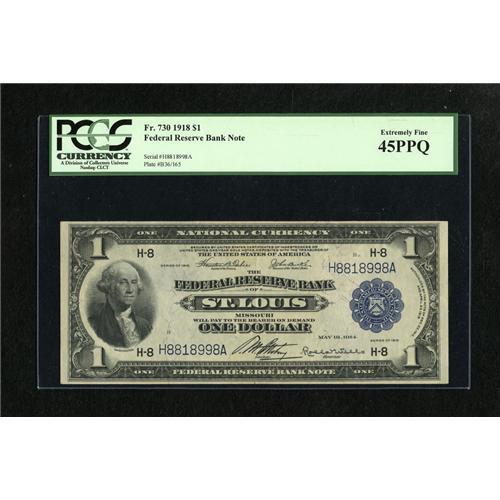 <B>Fr. 730 $1 1918 Federal Reserve Bank Note PCGS Extremely Fine 45PPQ.</B></I> This is a pleasing St. Louis Ace that retains nice color and solid edges.<BR><BR><b>Shipping:</b> Coins & Currency (<a target="_blank" href="http://www.heritageauctions.com/common/shipping.php">view shipping information</a>)