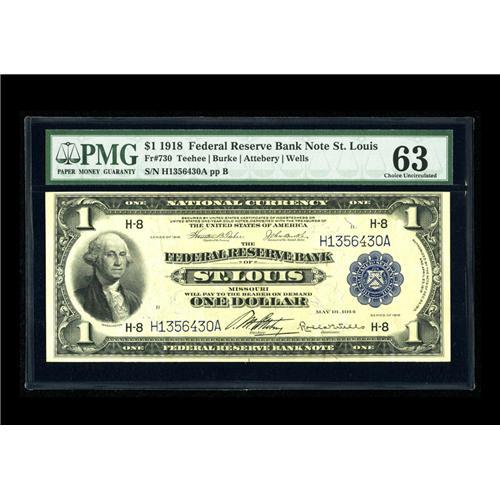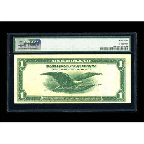 <B>Fr. 730 $1 1918 Federal Reserve Bank Note PMG Choice Uncirculated 63.</B></I> This previously unreported note will be added to the census right in the middle of a small group of other reported CU notes. The front to back centering affect the grade a touch, but the overall appearance is pleasing.<BR><I>From The Bill and Kathy Stella Currency Collection</B></I><BR><BR><b>Shipping:</b> Coin/Currency (<a target="_blank" href="http://www.heritageauctions.com/common/shipping.php">view shipping information</a>)