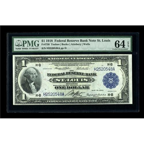 <B>Fr. 730 $1 1918 Federal Reserve Bank Note PMG Choice Uncirculated 64 EPQ.</B></I> A handsome $1 FRBN that has garnered the EPQ designation, and comes quite close to being a full Gem.<BR><BR><b>Shipping:</b> Coins & Currency (<a target="_blank" href="http://www.heritageauctions.com/common/shipping.php">view shipping information</a>)