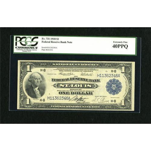 <B>Fr. 731 $1 1918 Federal Reserve Bank Note PCGS Extremely Fine 40PPQ.</B></I> Plenty of embossing is still noticed on this St. Louis Ace.<BR><I>From The Kansas City Collection</B></I><BR><BR><b>Shipping:</b> Coins & Currency (<a target="_blank" href="http://www.heritageauctions.com/common/shipping.php">view shipping information</a>)
