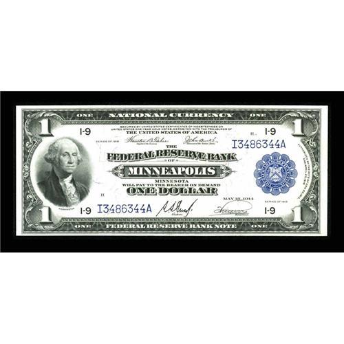 <B>Fr. 734 $1 1918 Federal Reserve Bank Note Extremely Fine-About New.</B></I> This embossed Minneapolis $1 has a couple of light folds.<BR><I>From The Collection of Greg Southward</B></I><BR><BR><b>Shipping:</b> Coins & Currency (<a target="_blank" href="http://www.heritageauctions.com/common/shipping.php">view shipping information</a>)
