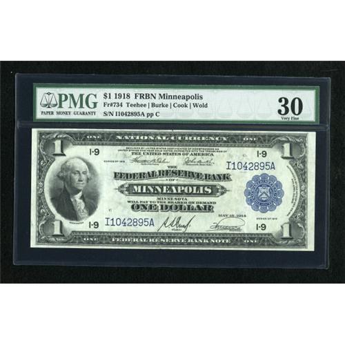 <B>Fr. 734 $1 1918 Federal Reserve Bank Note PMG Very Fine 30.</B></I> This attractive Minneapolis Ace boasts very bright and attractive paper. <BR><BR><b>Shipping:</b> Coins & Currency (<a target="_blank" href="http://www.heritageauctions.com/common/shipping.php">view shipping information</a>)