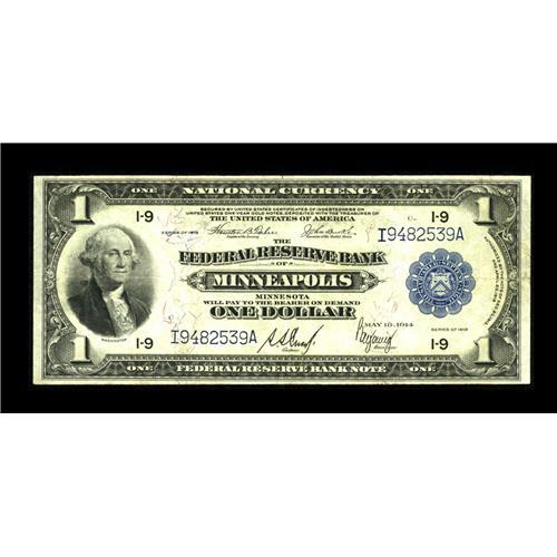 <B>Fr. 735 $1 1918 Federal Reserve Bank Note Fine-Very Fine.</B></I> The Teehee-Burke signature combination along with Cook and Young is known to be the toughest of the Minneapolis District FRBN Aces. There are approximately three dozen examples, which happens to make it one of the scarcest of all the FRBN Aces. This example is problem free, well margined, and remains bright.<BR><BR><b>Shipping:</b> Coin/Currency (<a target="_blank" href="http://www.heritageauctions.com/common/shipping.php">view shipping information</a>)