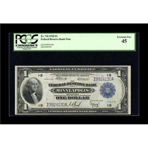 <B>Fr. 736 $1 1918 Federal Reserve Bank Note PCGS Extremely Fine 45.</B></I> This note appears AU as we only see a center and one margin fold. The paper is a touch soft, though the design is still bold as are the seals.<BR><BR><b>Shipping:</b> Coin/Currency (<a target="_blank" href="http://www.heritageauctions.com/common/shipping.php">view shipping information</a>)