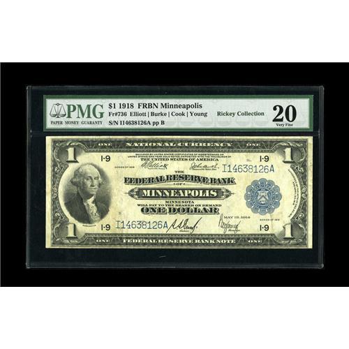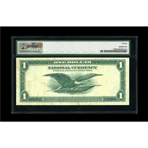 <B>Fr. 736 $1 1918 Federal Reserve Bank Note PMG Very Fine 20.</B></I> While one would not expect this note to be scarce, an average of four pieces have appeared on the market each year for the last five years. This piece is average circulated with no problems to speak of.<BR><I>Ex: Rickey Collection</B></I>