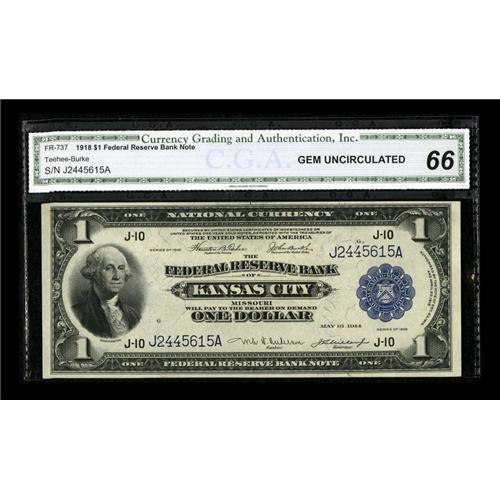 <B>Fr. 737 $1 1918 Federal Reserve Bank Note CGA Gem Uncirculated 66.</B></I> This $1 has strong embossing.<BR><BR><b>Shipping:</b> Coins & Currency (<a target="_blank" href="http://www.heritageauctions.com/common/shipping.php">view shipping information</a>)