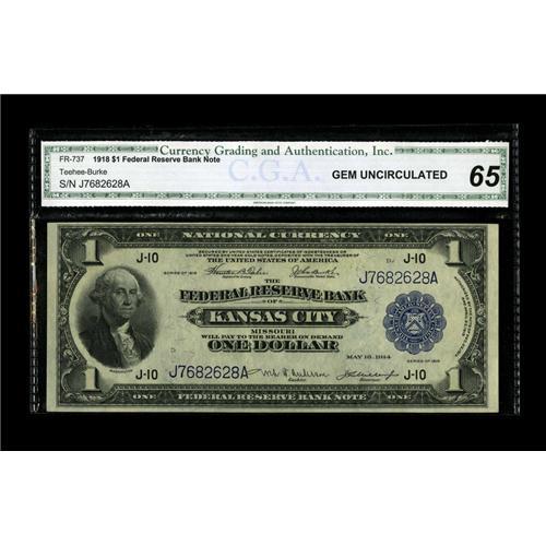 <B>Fr. 737 $1 1918 Federal Reserve Bank Note CGA Gem Uncirculated 65.</B></I> A well centered Gem with sharp corners and excellent eye appeal for the grade. Plenty of embossing is seen.<BR><BR><b>Shipping:</b> Coins & Currency (<a target="_blank" href="http://www.heritageauctions.com/common/shipping.php">view shipping information</a>)