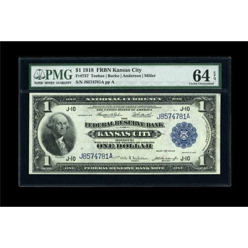 <B>Fr. 737 $1 1918 Federal Reserve Bank Note PMG Choice Uncirculated 64 EPQ.</B></I> Perfectly even, gem sized margins are noted on this Kansas City ace.<BR><BR><b>Shipping:</b> Coins & Currency (<a target="_blank" href="http://www.heritageauctions.com/common/shipping.php">view shipping information</a>)