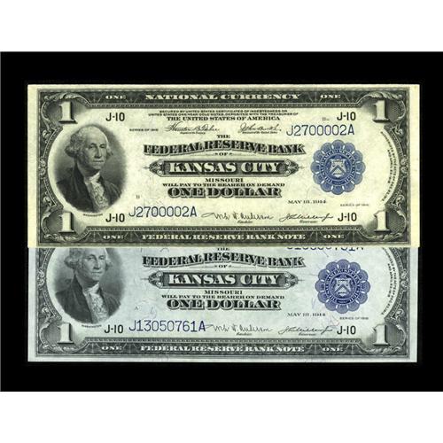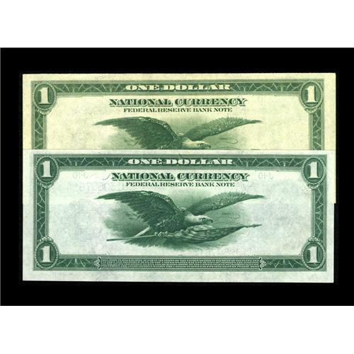 <B>Fr. 737, Fr. 738 $1 1918 Federal Reserve Bank Notes About New.</B></I> This pair of Green Eagles is a contrast of preferences. The Fr. 737 is bit subdued with a bend visible. The Fr. 738 has bright surfaces with prominent embossing interrupted only by a center fold.<BR><BR><b>Shipping:</b> Coin/Currency (<a target="_blank" href="http://www.heritageauctions.com/common/shipping.php">view shipping information</a>)