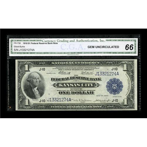 <B>Fr. 738 $1 1918 Federal Reserve Bank Note CGA Gem Uncirculated 66.</B></I> The embossing is more defined on the bottom serial number of this $1.<BR><BR><b>Shipping:</b> Coins & Currency (<a target="_blank" href="http://www.heritageauctions.com/common/shipping.php">view shipping information</a>)