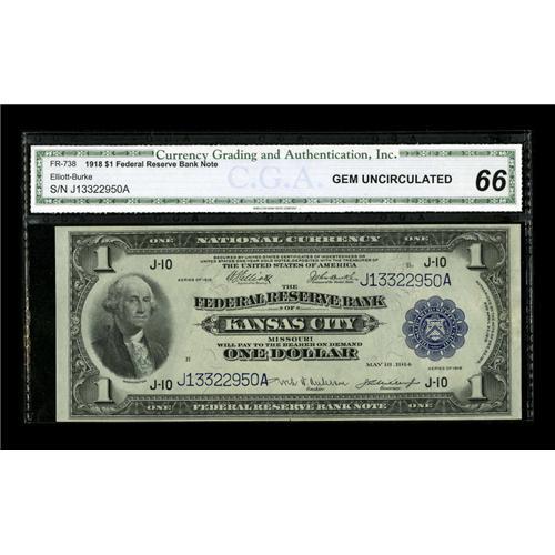 <B>Fr. 738 $1 1918 Federal Reserve Bank Note CGA Gem Uncirculated 66.</B></I> A bright and lovely well-margined example that is a trifle flat. Not a rare number, but an exceptionally high-grade note.<BR><BR><b>Shipping:</b> Coins & Currency (<a target="_blank" href="http://www.heritageauctions.com/common/shipping.php">view shipping information</a>)