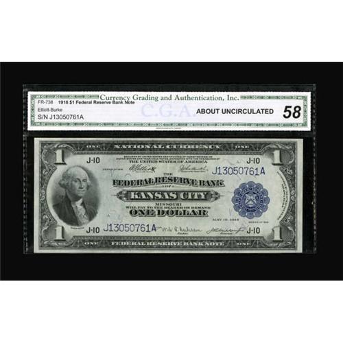 <B>Fr. 738 $1 1918 Federal Reserve Bank Note CGA About Uncirculated 58.</B></I> Broad margins and excellent embossing are seen on this Kansas City ace with a soft center fold.<BR><BR><b>Shipping:</b> Coins & Currency (<a target="_blank" href="http://www.heritageauctions.com/common/shipping.php">view shipping information</a>)