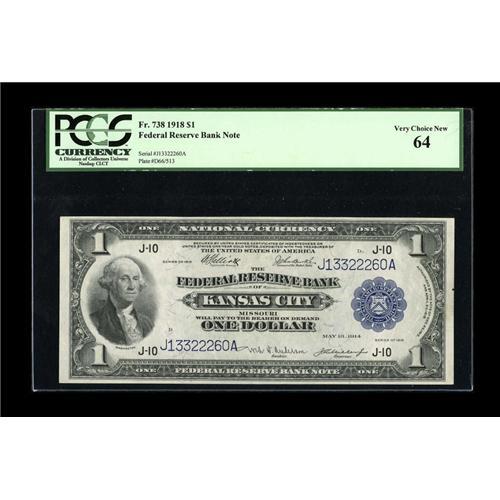 <B>Fr. 738 $1 1918 Federal Reserve Bank Note PCGS Very Choice New 64.</B></I> A nicely centered "Eagle Holding Flag" note off the tougher KC district.<BR><I>From The Collection of Greg Southward</B></I><BR><BR><b>Shipping:</b> Coins & Currency (<a target="_blank" href="http://www.heritageauctions.com/common/shipping.php">view shipping information</a>)