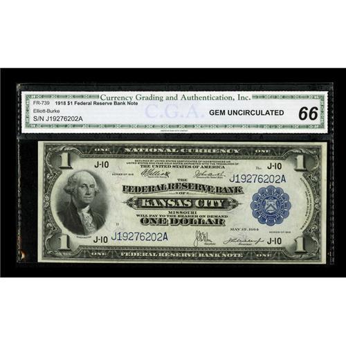 <B>Fr. 739 $1 1918 Federal Reserve Bank Note CGA Gem Uncirculated 66.</B></I> Bold embossing adorns this $1.<BR><BR><b>Shipping:</b> Coins & Currency (<a target="_blank" href="http://www.heritageauctions.com/common/shipping.php">view shipping information</a>)
