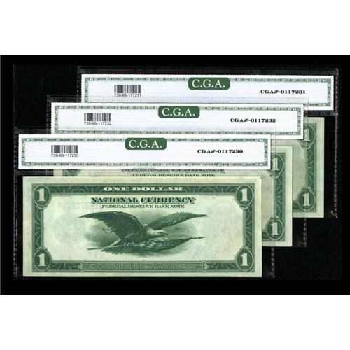 <B>Fr. 739 $1 1918 Federal Reserve Bank Notes Three Consecutive Examples CGA Gem Uncirculated 66.</B></I> This wonderful trio was separated from the D position note. Pleasing surfaces can be seen beneath the holders.<BR><BR><b>Shipping:</b> Coins & Currency (<a target="_blank" href="http://www.heritageauctions.com/common/shipping.php">view shipping information</a>)
