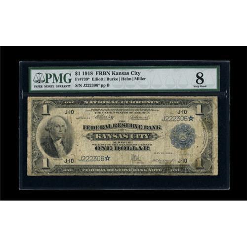 <B>Fr. 739 $1 1918 Federal Reserve Bank Star Note PMG Very Good 8.</B></I> This piece has been off the market for five years and is one of only five replacement notes known for this Kansas City issue. Auction appearances are few and far between.<BR><BR><b>Shipping:</b> Coins & Currency (<a target="_blank" href="http://www.heritageauctions.com/common/shipping.php">view shipping information</a>)